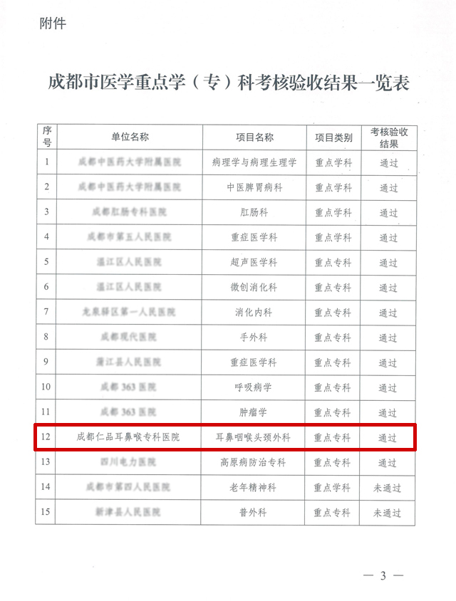 11月22日,成都市卫生和计划生育委员会发布了《成都市医学重点学科(实验室)及重点专科建设项目考核验收结果的通知》红头文件(成卫计函[2018]274号),成都仁品耳鼻喉专科医院耳鼻喉重点专科建设项目通过评审验收,这标志着我院的学科建设再次取得新突破,医院发展迈上一个新的台阶!
